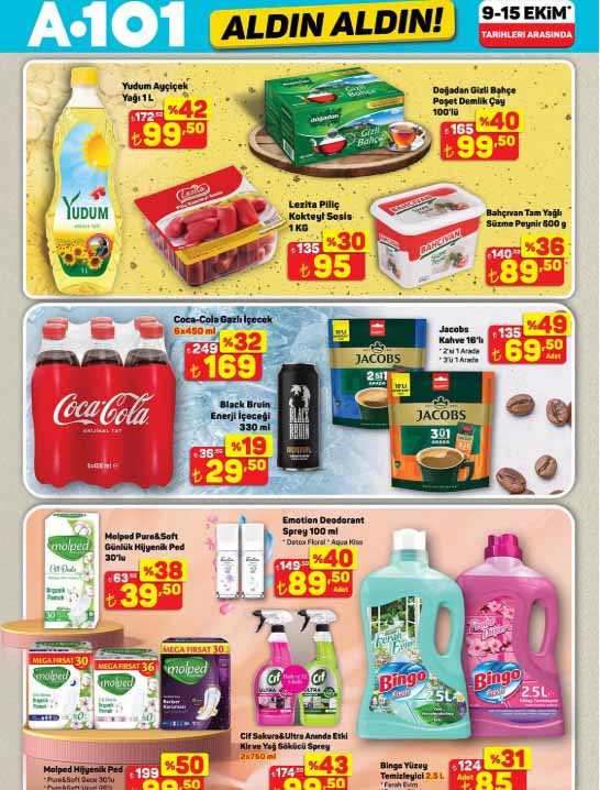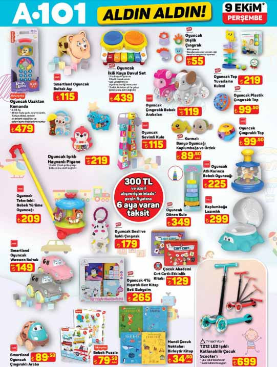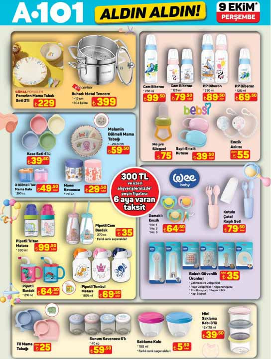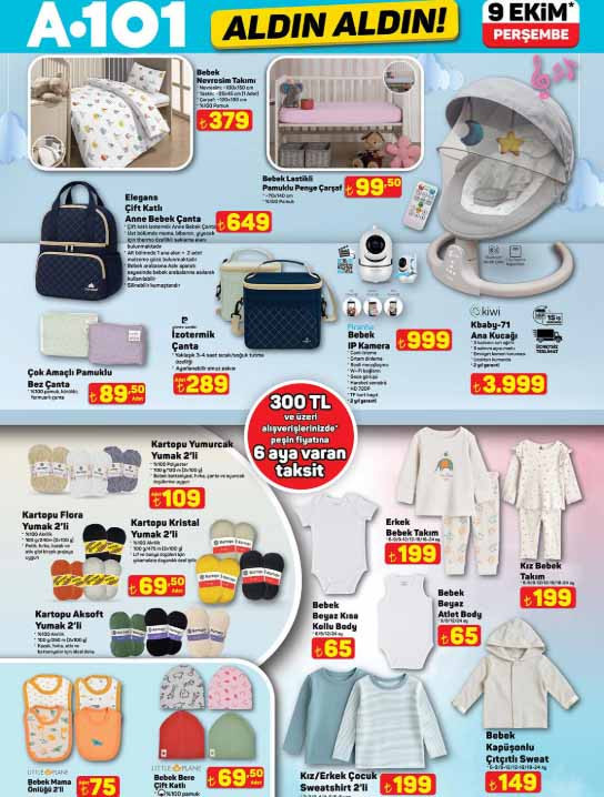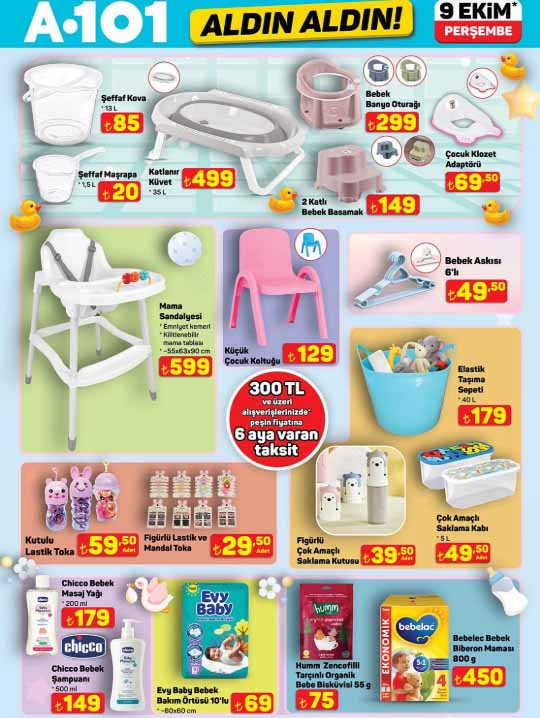 A101 bu hafta aktüel kataloğu ürünleri alışveriş severlerin dikkatini çekiyor. 9 Ekim 2025 A101 Aldın Aldın afişi ile koltuk ve halı yıkama makinesinden büro tipi buzdolabına pek çok ihtiyaca yönelik çeşitli ürünleri satışa sunacak. A101 indirim broşürü içerisinde; 125 ml cam biberon 79,50 TL, oyuncak tekerlekli bebek yürüme oyuncağı 209 TL, 6’lı bebek askısı 49,50 TL, küçük çocuk koltuğu 129 TL, dekoratif duvar saati 229 TL, çift katlı anne bebek çanta 649 TL, beyaz kısa kollu bebek body 65 TL, oyuncak tekerlekli bebek yürüme oyuncağı 209 TL, bebek puzzle 79,50 TL ile satışa sunulacak. A101 Aldın Aldın ürünleri Perşembe günü raflardan sepete eklenmek için hazır olarak alışveriş severleri bekleyecek. Peki A101 aktüel ürünleri kataloğu bu hafta neler sunuyor? İşte A101 Aldın Aldın kataloğu 9 Ekim 2025 ürünleri…